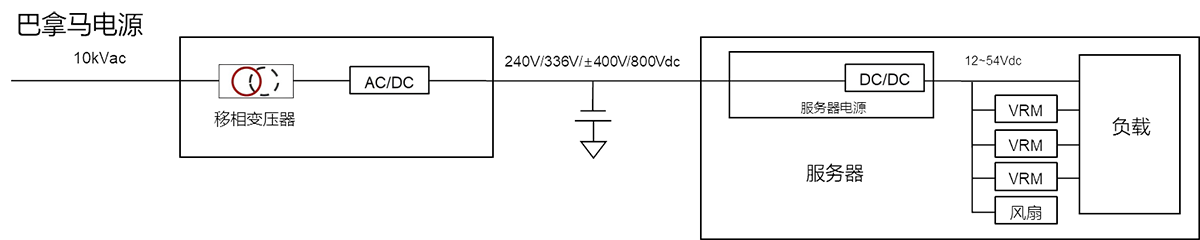 巴拿马电源架构:在HVDC系统上进一步简化,取代了传统架构的众多中间设备功率模块,相较于HVDC,巴拿马电源最大的变化为采用移相变压器替代传统工频变压器,将降压与整流功能合二为一,可直接将输入的10kV市电转化为240V/336V/±400V/800V等高压直流。目前数据中心巴拿马电源使系统典型效率增至97.5%。