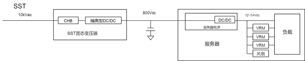SST固态变压器:SST的基本工作原理是先将输入的工频交流电通过整流器转换为直流电,接着利用逆变器将直流电逆变为高频交流电,再通过高频变压器进行电压变换和电气隔离,最后经整流将高频交流电还原为所需电压等级的直流电输出。相较于巴拿马电源,采用基于电力电子变换技术的固态变压器(拥有三级功率变换架构),可通过高频变压器实现电气隔离与电压匹配,直接完成10kV交流到800V直流的转换,eff约98%。