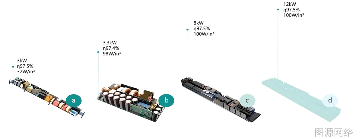 功率密度持续提升:以某头部厂家为例,其PSU升级路线中,PSU架构从3.3kW、5.5kW到12kW、22kW的电源功率进阶,功率密度将从32W/立方英寸提升至100W/立方英寸,核心是通过硅、Sic、GaN等半导体材料提升电源的功率密度,以在有限的空间内提供更高的功率输出。