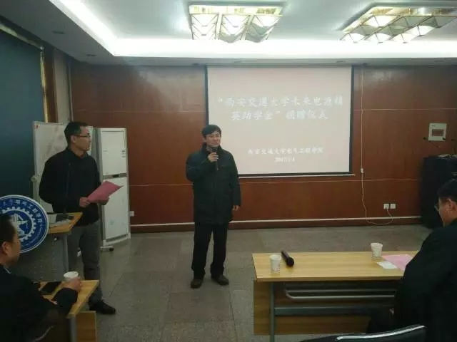 2017年1月4日上午,第二期“西安交通大学东升国际未来电源精英助学金”捐赠仪式在电气工程学院北会议室顺利召开。本次捐赠仪式由西安交通大学电气学院党委副书记宋杰主持,出席仪式的捐赠方代表有:电源村村长代新社,亿曼丰科技(深圳)有限公司向总经理,合肥东升国际电源系统有限公司总经理傅仕涛、研发经理唐德平,陕西东升国际能源科技有限公司经理鲍鑫,合肥东升国际电源系统有限公司助理汪艳,西安爱科赛博电气股份有限公司董事长白小青;出席仪式的西安交通大学领导有:电气学院副院长杨旭、电气学院党委副书记宋杰、电气学院学生工作主管高丹军、电气学院辅导员李茜。