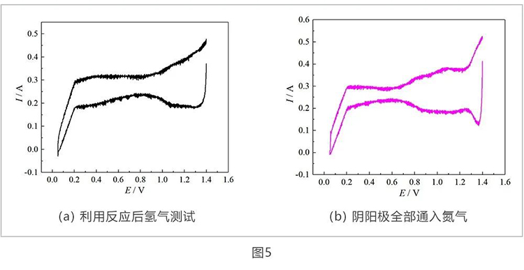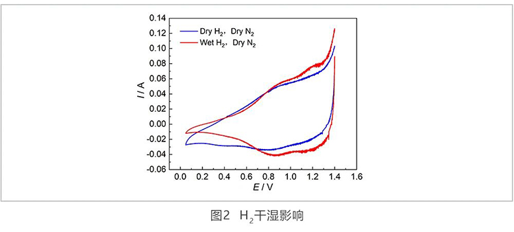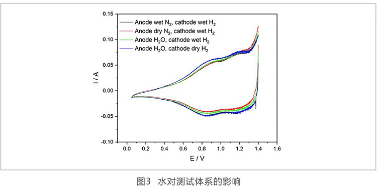电解水在执行CV过程中,一般氢气需要与催化剂中的Pt建立平衡电位,类似于标准电极,因此阴极侧通入氢气是必要的。而对于水来说,其需要与阳极侧催化剂活性位点发生类似于氧化还原的反应,使得金属活性位点表现出类似于被氧化的状态,并形成活性位点的氧化还原峰。在没有水的情况下,CV过程中这种活性位点的氧化还原很难完成,从图2中也可以看出,在电位高于0.8V时,CV曲线没有表现出明显的峰。从图3的结果说明,体系中只要有水,并保证测试体系始终处于一定的湿润状态,即可达到稳定测试的能力。至于水是通过气体回路加入,还是直接由阳极侧通入,并不会对结果造成显著的影响,这也为今后电解水CV测试条件开辟了一条新的路径。