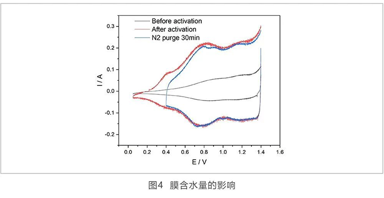 为了进一步验证体系含水量的影响,作者还测试了电池拉载前后的CV曲线,如图4所示。其中活化之前的测试为新装膜电极,并且阳极通入去离子水,阴极侧干氢气。该条件下,CV曲线氧化还原电流信号不明显,有可能是活性位点未充分暴露所导致的,但与图2中纯干气测试相比,高电位区域有一定的峰形出现。进一步的,作者将该膜电极进行活化,具体为50A条件下恒流拉载4h,然后将阳极侧换成干氮气,阴极侧通入干氢气,再次测试CV曲线。在该条件下,所测试的CV曲线与图3中阴阳极分别为加湿氢气和加湿氮气的曲线并无太大区别。这有可能是电池内部,如钛毡仍然含有一定的水,能够满足CV测试需求。进一步的,将该单电解池阴阳极均用干氮气吹扫30min,随后再次测试CV。与活化后的曲线相比,峰形有所变化,但仍然能在高电位区域看出催化剂的氧化还原峰形状。这说明只要体系内部含有一定量的水,对CV测试结果不会造成太大的影响。