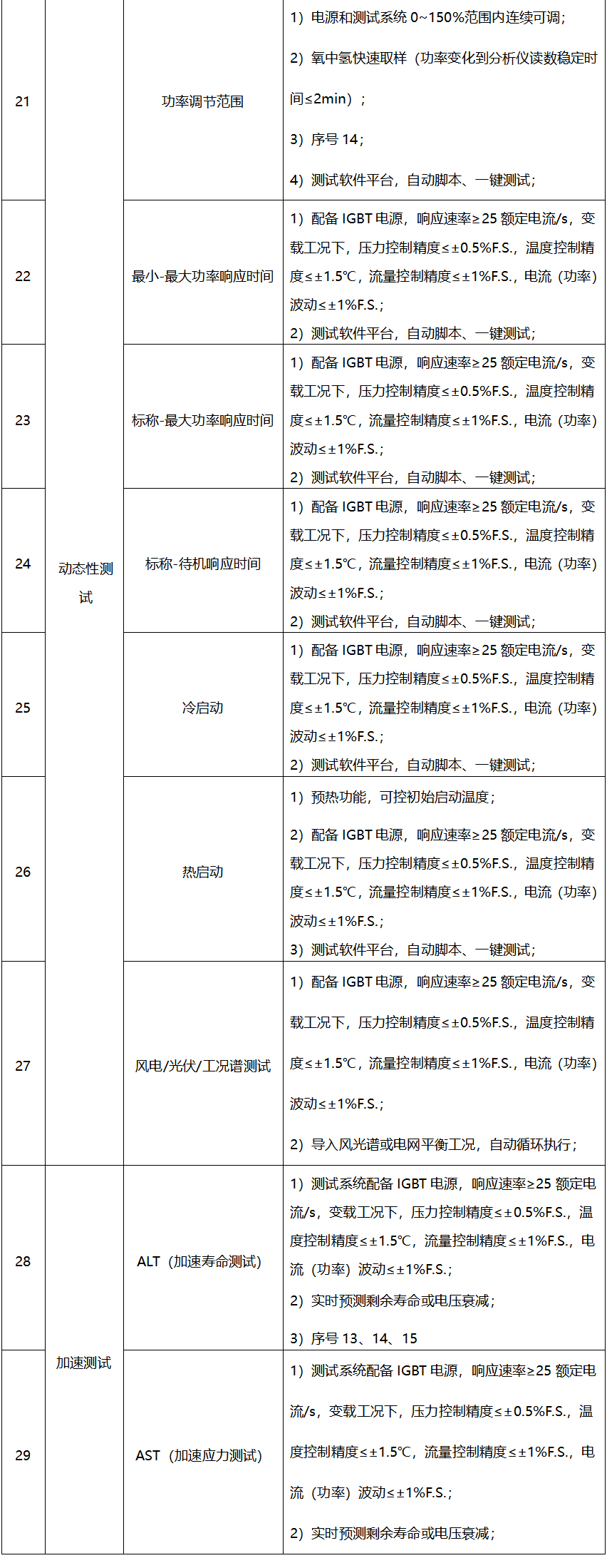电解槽测试系统的动态性体现在氧中氢快速取样(功率变化到分析仪读数稳定时间≤2min)、升降压快(≥10kPa/s@>50%额定产氢量或预增压工况)、压力变化响应时间短(<1s)、升降温速率高(3~5℃/min)、碱液/纯水流量调节快(≤20s)等方面。电源最大变载速率≥25%额定电流/s,并且在变载工况下,压力控制精度≤±0.5%F.S.,温度控制精度≤±1.5℃,流量控制精度≤±1%F.S.,电流(功率)波动≤±1%F.S.。